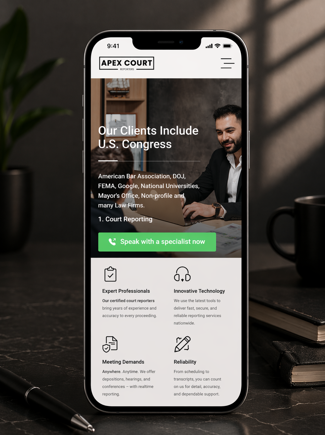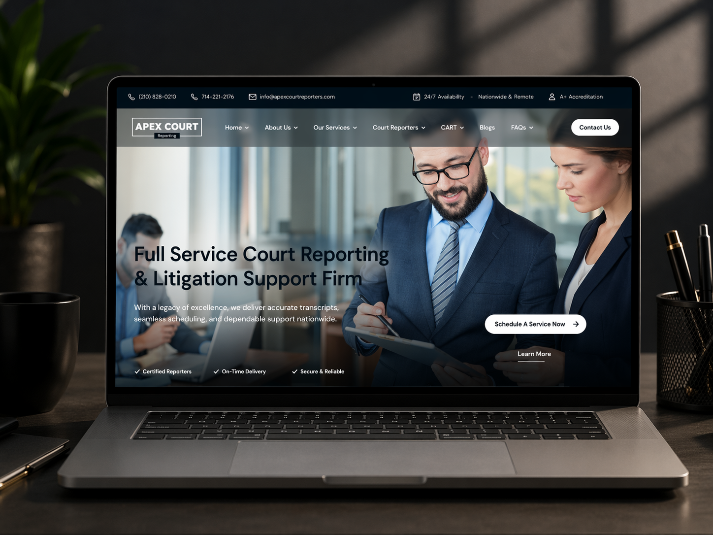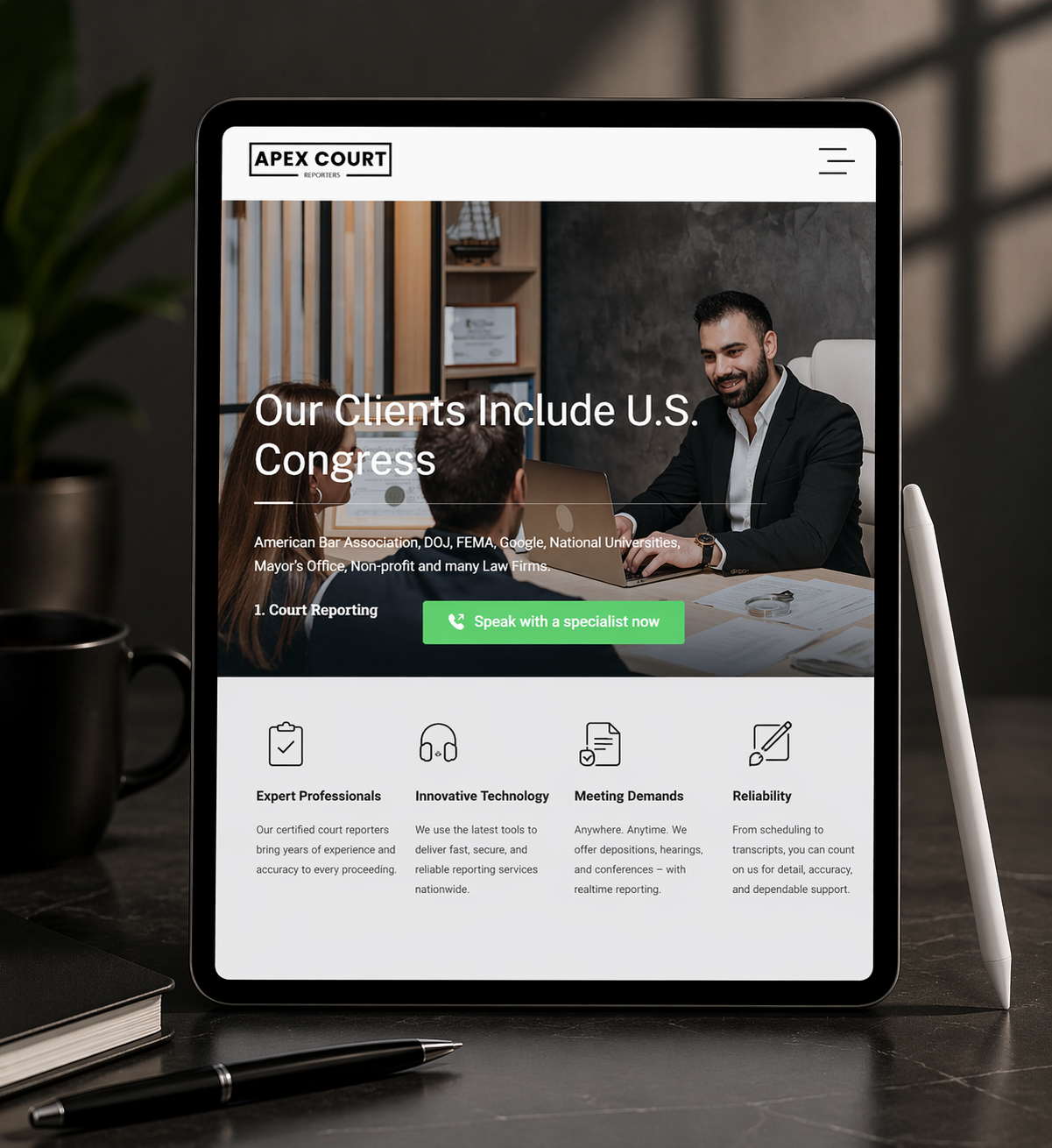 Apex Court Reporting Website A professional legal services platform designed for court reporting, litigation support, and nationwide case management solutions. Strategy Web Design, UI/UX Design, Legal Service Platform Client Apex Court Reporting Country United States apexcourtreporters.com Share: